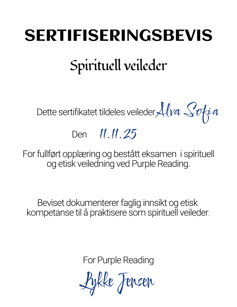 Jeg har 16 år med selvutvikling og tatt mange kurs/utdannelser innen forskjellige healingformer, åndelig veiledning, holistisk naturterapi, energiarbeid og kanalisering. Har nylig tatt lengre utdannelser som astrolog og traumeterapeut. Som gir meg helhetlig forståelse om kropp, personlighet, sjel og høyere selv.